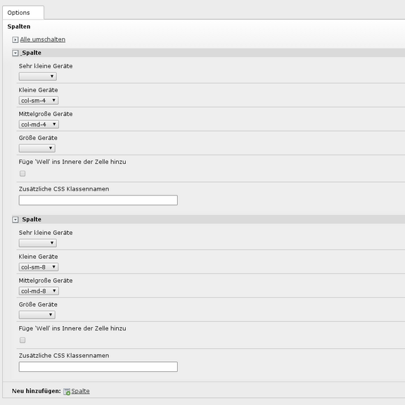 Bootstrap 5 kommt mit einem komplexen Grid-System, um Elemente in den verschiedenen Ansichten optimal positionieren zu können. Im Backend stehen dem Redakteur bei den Grid-Elementen verschiedene Auswahlmöglichkeiten je nach Ansicht (Smartphone, Tablet, Desktop, Großer Bildschirm) zur Verfügung.